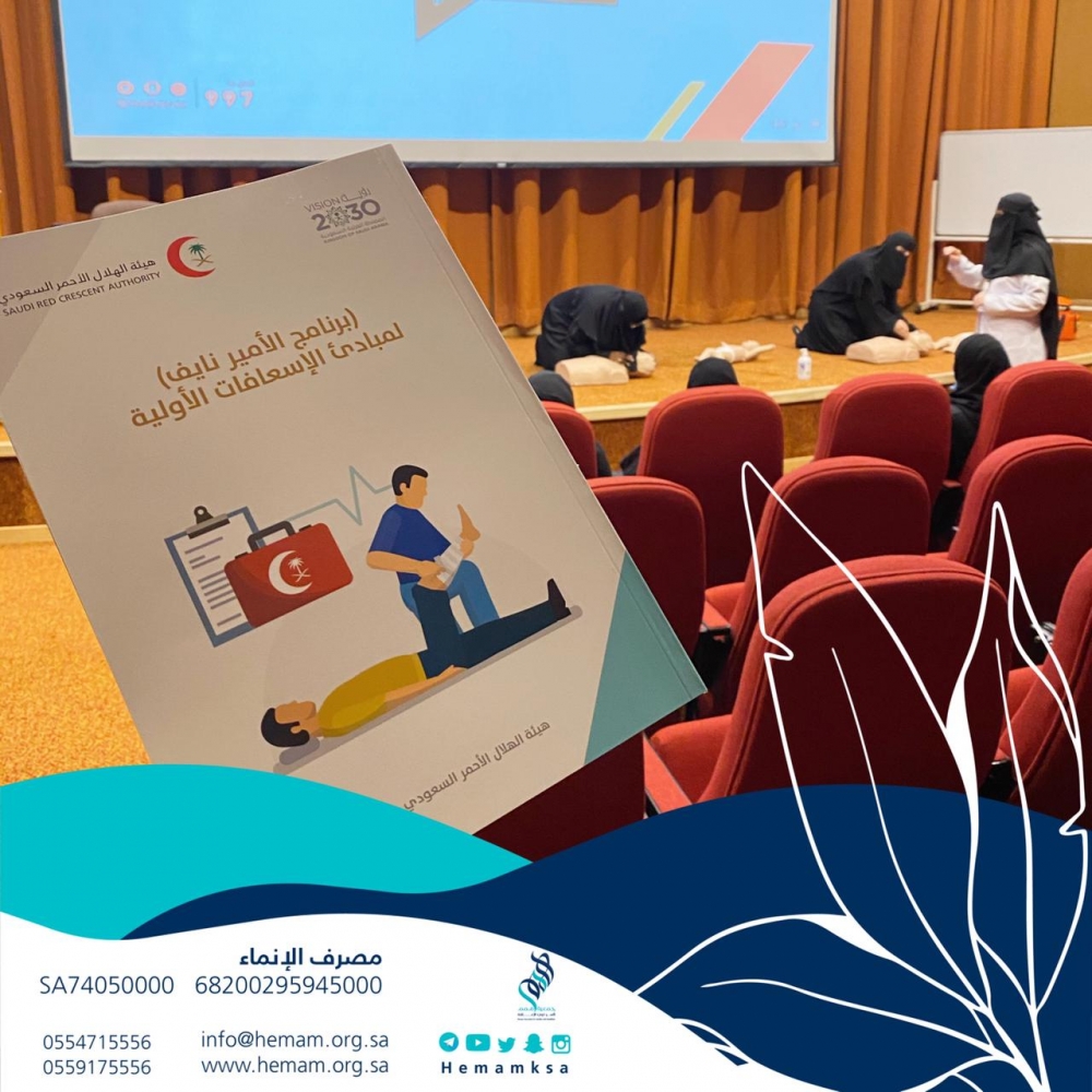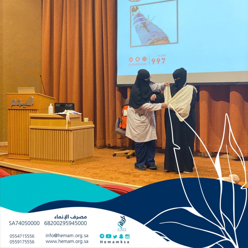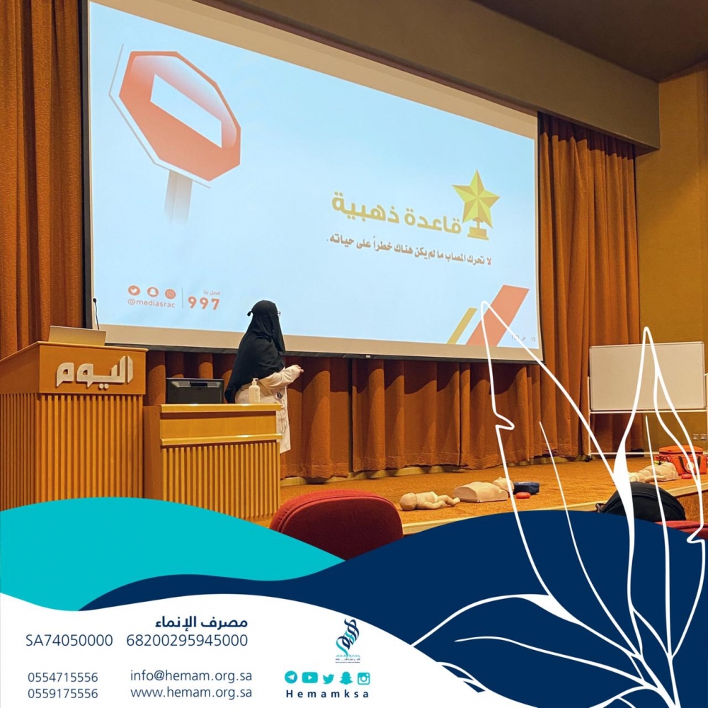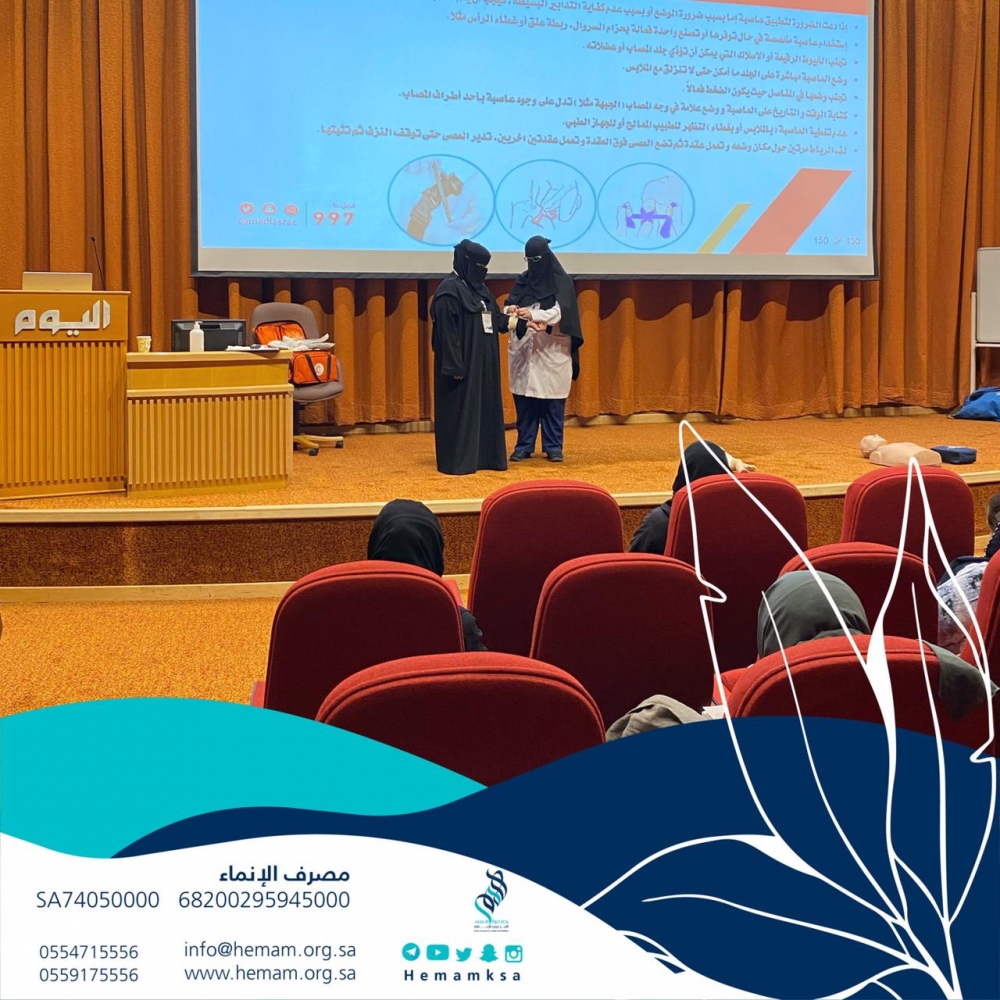 بالتعاون مع هيئة الهلال الأحمر السعودي همم تقيم محاضرة الإسعافات الأولية باستضافة كريمة من دار اليوم للإعلام لأسرنا من الأشخاص ذوي الإعاقة وفريق العمل، قدمت المحاضرة مدير الشؤون الأكاديمية للتدريب لفرع هيئة الهلال الأحمر السعودي وعضو مجلس إدارة جمعية همم د.الاء الدبيكل